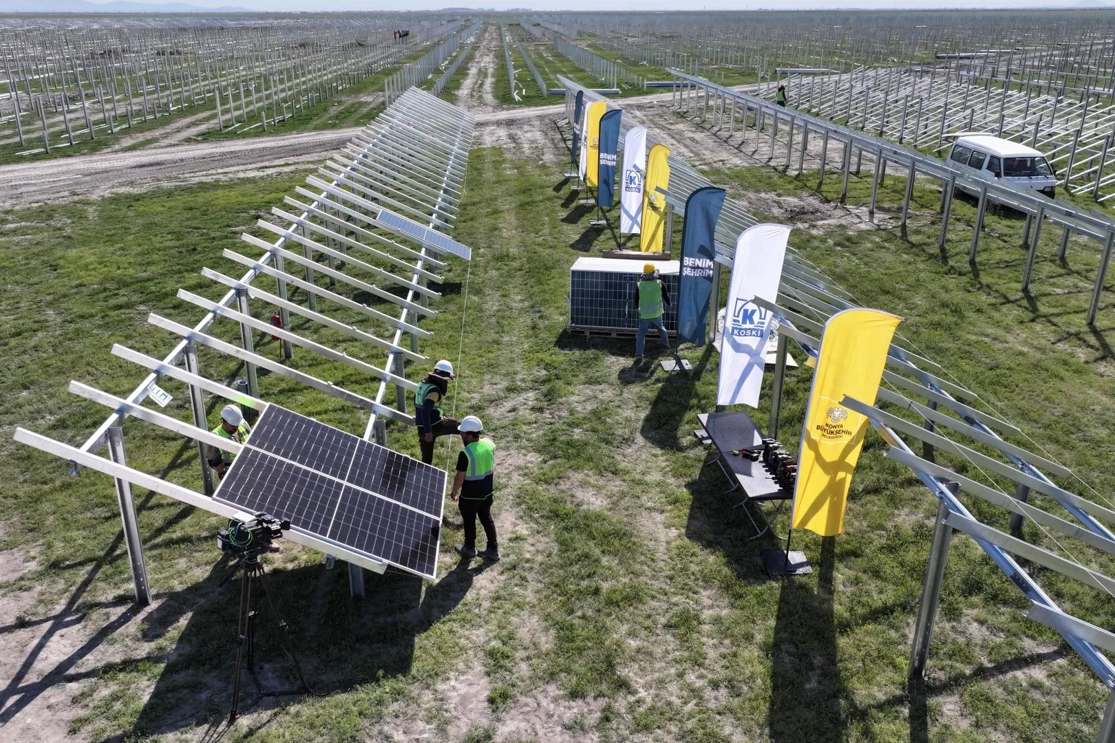 Başkan Altay, iş başlangıcı gerçekleştirilen GES projesi ile sonbaharda elektrik üretmeyi hedeflediklerini belirterek, “Şu anda Konya Büyükşehir Belediyesi olarak toplam 35 MW'lık bir yenilenebilir enerji yatırımımız var. Bunun 25 MW'ı Mavi HES'te, 1.4 MW'ı Seçme HES Tesislerimizde. Kalan kısmı da GES yatırımı olarak şu anda faaliyette. Bugün inşallah hep birlikte 70 MW'lık KOSKİ ve Büyükşehir Belediyemizin GES yatırımının panel koyma programını gerçekleştiriyoruz. İnşallah bir aksilik olmazsa Temmuz sonu, Ağustos başı gibi buradaki işlemimizi bitirmeyi arzu ediyoruz. Eylül ayı gibi burada elektrik üretmeyi planlıyoruz” açıklamalarını yaptı.