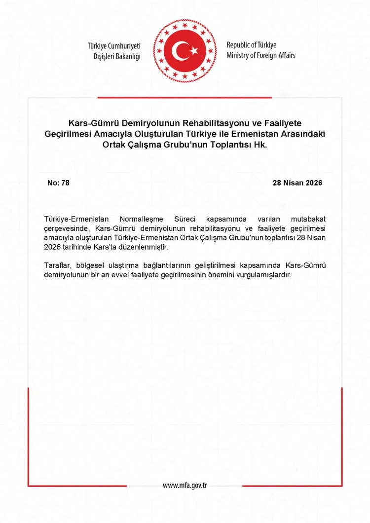 Dışişleri Bakanlığı, Kars-Gümrü demiryolunun rehabilitasyonu ve yeniden faaliyete geçirilmesi amacıyla kurulan Ortak Çalışma Grubu’nun 28 Nisan 2026 tarihinde Kars’ta toplandığını açıkladı.
