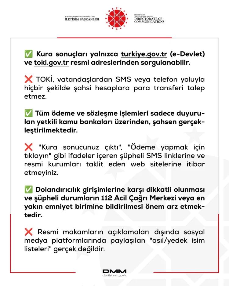 Dezenformasyonla Mücadele Merkezi, TOKİ’nin “Yüzyılın Konut Projesi” sürecinde vatandaşları hedef alan dolandırıcılık girişimlerine karşı uyardı.
