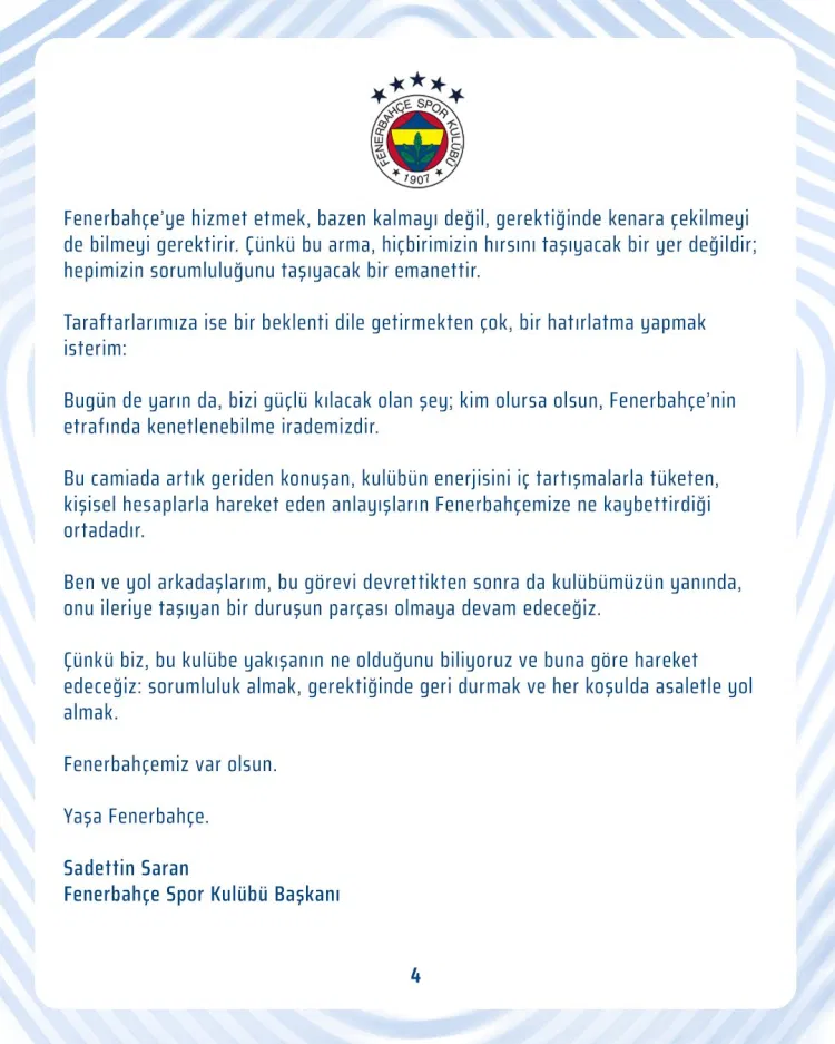 İSTANBUL (İGFA) - Fenerbahçe Spor Kulübü Başkanı Sadettin Saran, Fenerbahçe camiasına yönelik yayımladığı açıklamada, görev süreci ve alınan olağanüstü kongre kararına ilişkin değerlendirmelerde bulundu.